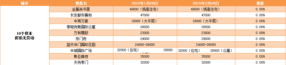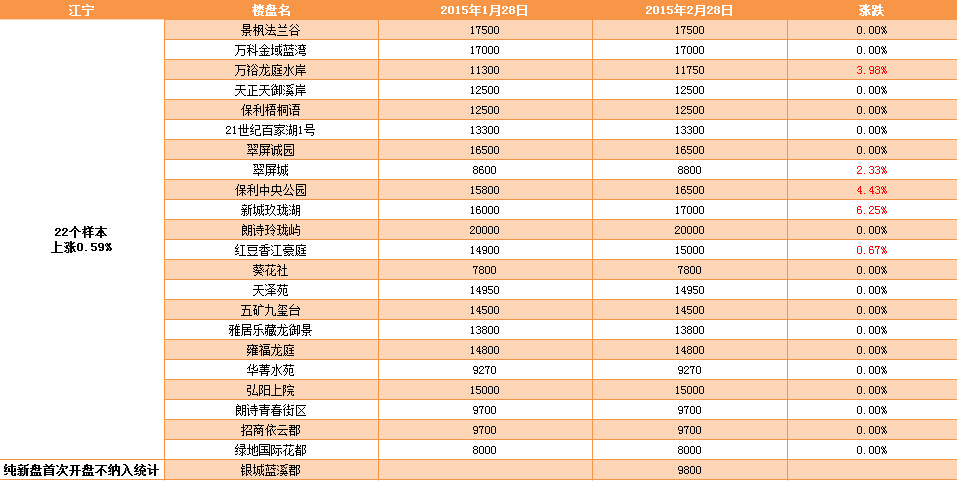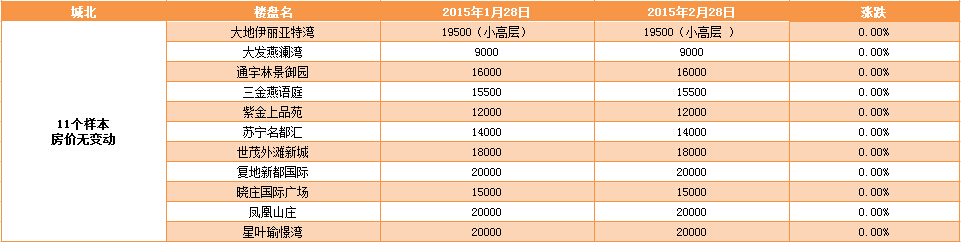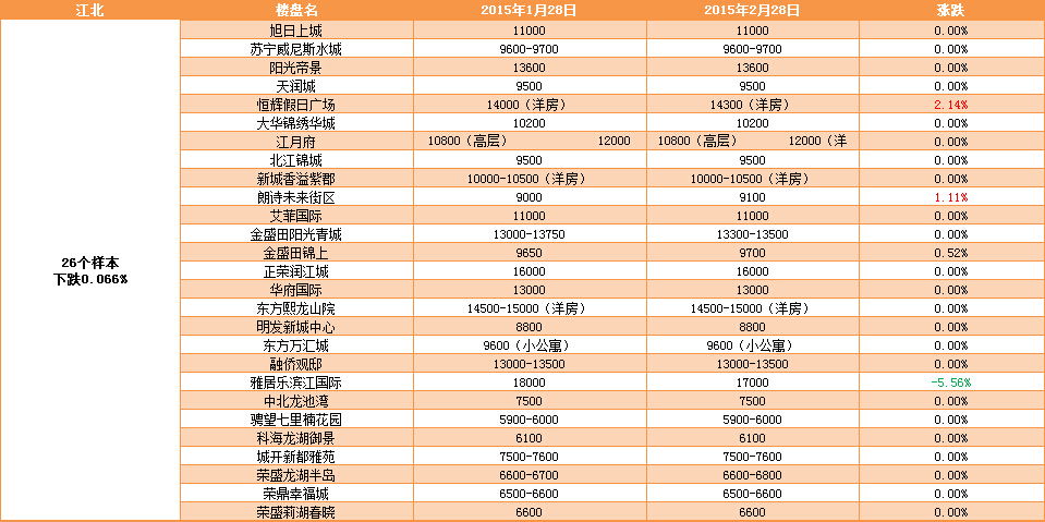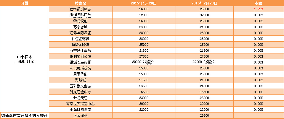 新华房产记者统计发现,2015年2月南京楼市八大板块中,江宁、河西、城东房价上涨,江北房价下跌,其余板块房价无变动。 综合结果,2月房价环比微涨0.12%。 [详细]