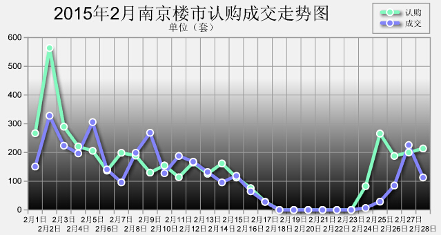 截止到2月28日,南京网上房地产数据显示,2月南京楼市新房认购4094套、成交3295套,日均卖房146套。环比上月(备注:2015年1月南京楼市商品住宅认购6937套、成交6349套,日均卖房132套)认购量下跌4成,成交量下跌近5成。 与去年相比(备注:2014年2月南京楼市商品住宅认购3574套,成交3459套,日均卖房127套)。认购量上涨15%,成交量下跌4.7%。 …[详细]