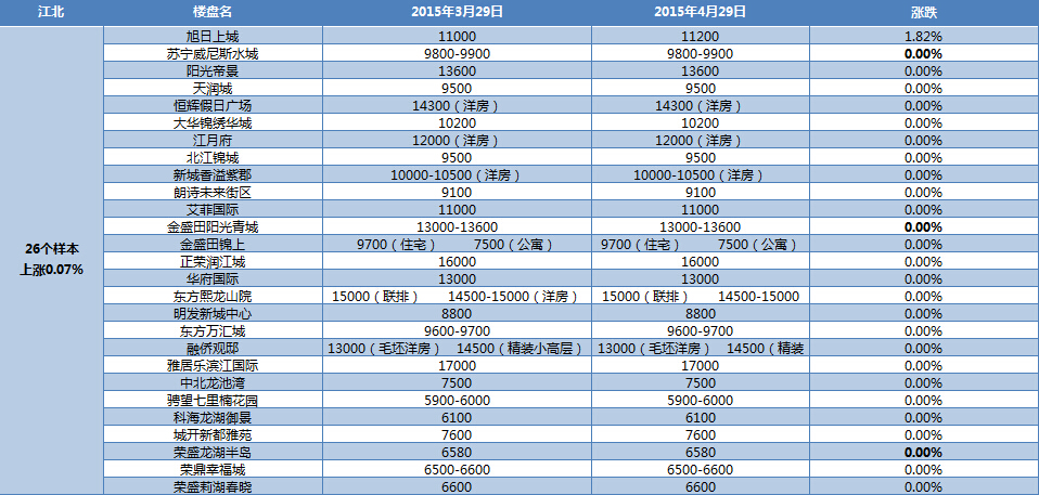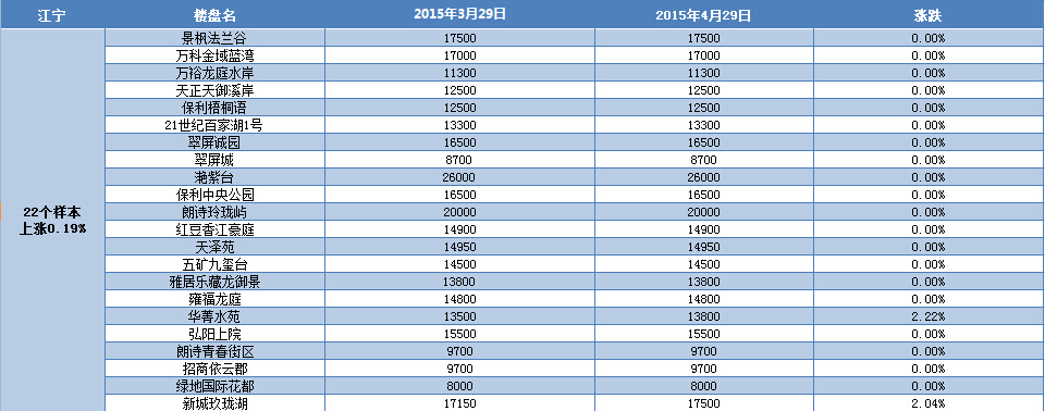 近日,新华房产通过对南京八大板块在售的127家楼盘进行了房价涨跌统计,结果发现,4月,南京房价环比微涨0.22%。其中,仙林、城东、江宁、江北房价出现了不同程度的涨幅,其余板块房价持平。 [详细]