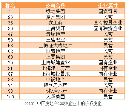 在中国房地产测评中心公布的“2013年中国房地产开发企业500强”中,上海本土共16家房企入围,其中近一半房企是国有或国资背景的开发商。它们分别是:绿地集团、农工商、上海城开、上海城建置业、上海建工房产、上海城投置地、上投房地产。[详细]