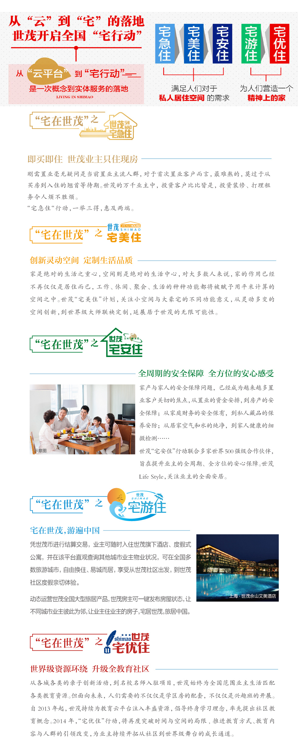 品牌房企的转型一定从程度上代表了房企未来的走势,随着住宅市场的不断成熟,仅靠规模增长已难以满足企业可持续发展的需求。2014年8月底世茂开启“宅行动”,推出“宅急住、宅美住、宅安住、宅游住、宅优住”五大计划全面落地云平台。[详细]