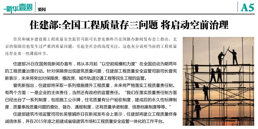 住建部:全国工程质量存三问题