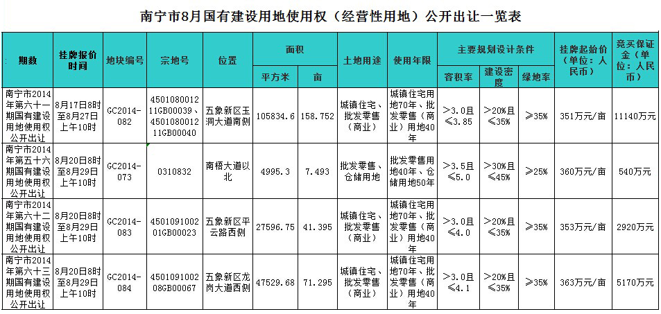 7月23日,位于南宁市鲁班路西面、科德路南面的编号为GC2014-064地块,由南宁禾田信息港发展有限公司以底价210万元/亩揽获,成交总额10828.8432万元(约1.08亿),总面积34377.28平方米(折合51.566亩)。据出让公告显示,该出让地块分为两宗地,其中约有10.181亩土地用于住宿餐饮及批发零售,其余为工业用地。工业用地50年、住宿餐饮用地40年、批发零售用地40年。 [详细] |