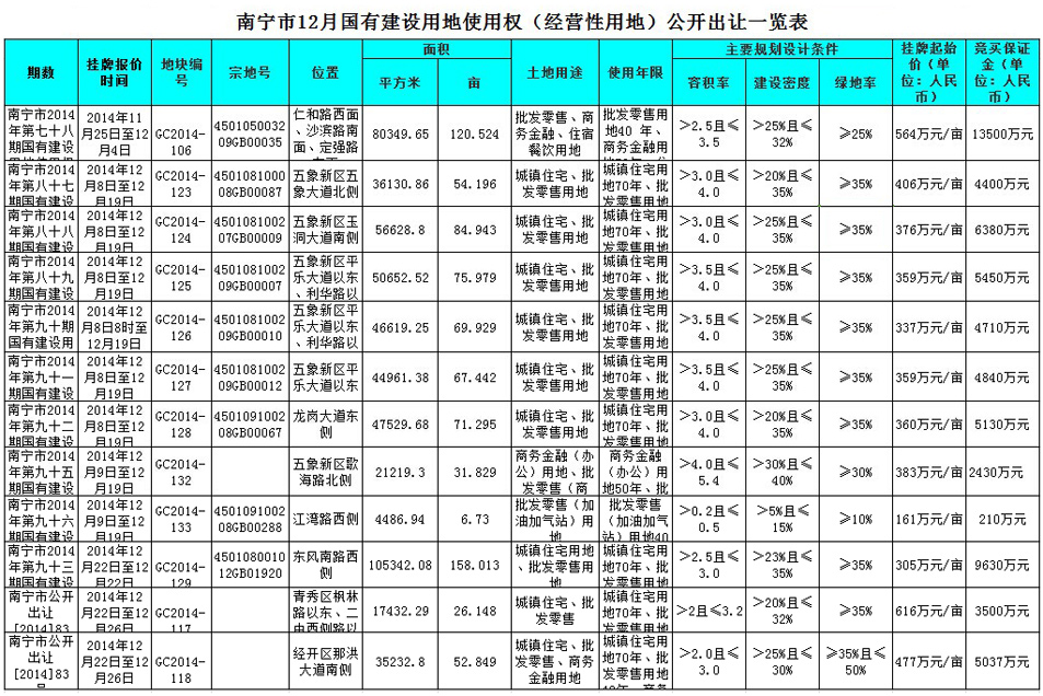 原定于11月26日出让的位于那洪大道南侧、友谊路东面的GC2014-109地块,因无人报价导致流挂...[详情点击]