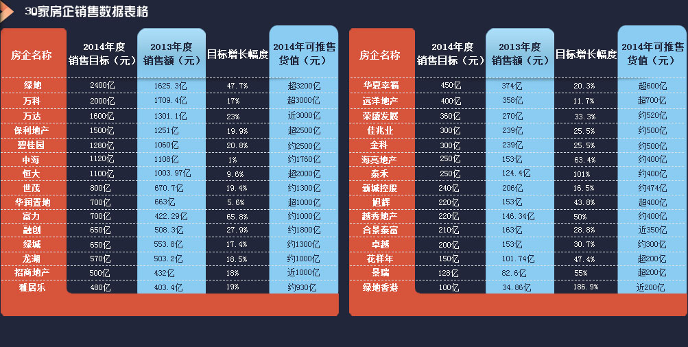| 近日,多家上市房企陆续发布了2013年的年报,对于2014年的业绩目标以及市场走势,各家房企有着不同的解读。万科作为行业翘楚,其2000亿元的年度销售目标相对保守; 万达、绿地均为2400亿元的目标则是超越万科,来势凶猛;而碧桂园、融创、佳兆业、旭辉等公司则大幅提高了今年的销售目标。在年初部分城市楼市陷入低潮之时,显然开发商对2014年全年的市场环境相对看好。穆迪投资者服务公司则指出,中国房企销售增长在2013年中已开始呈现放缓迹象,预计中国房地产开发商的合约销售增长,将由去年的26.6%大幅放缓至今年的10%左右。 | ||