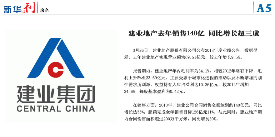 建业地产去年销售140亿元