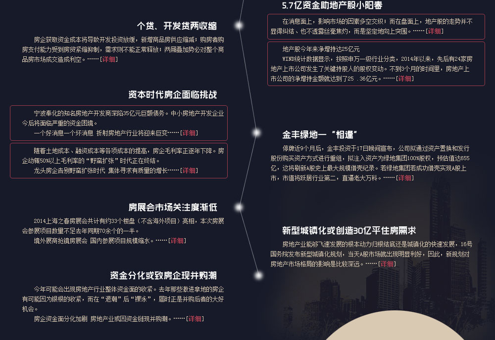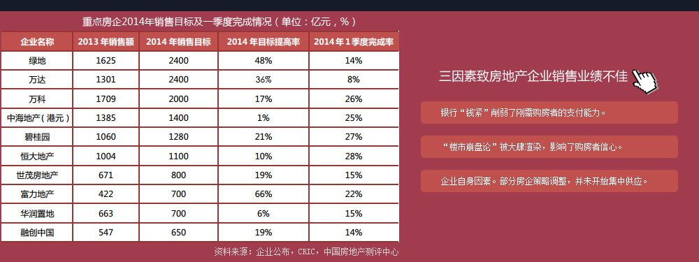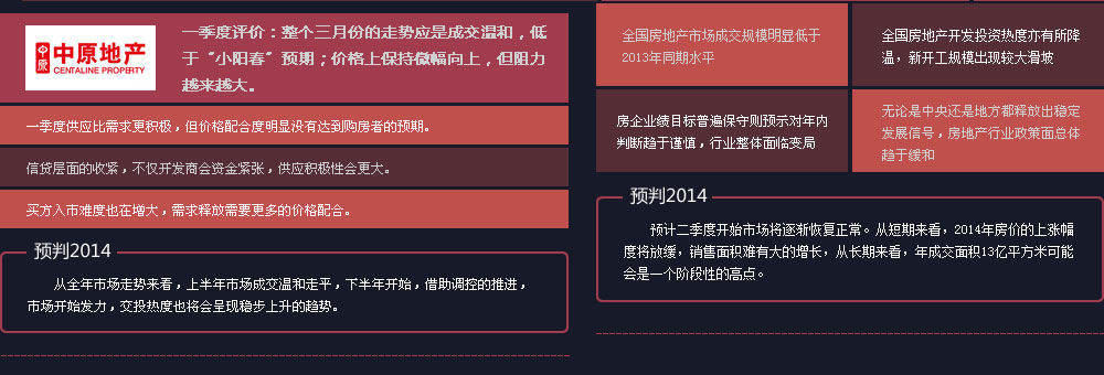 | 龙头房企年报普遍呈现三大特征:2013年业绩大幅增长,2014年销售目标则相对谨慎;毛利率集体下降,但净资产收益率等指标稳定增长;去存货、快周转,成为应对行业调整期的统一动作。在有效控制销售成本、融资成本的情况下,也不排除通过价格策略的调整,抢收2014。 |