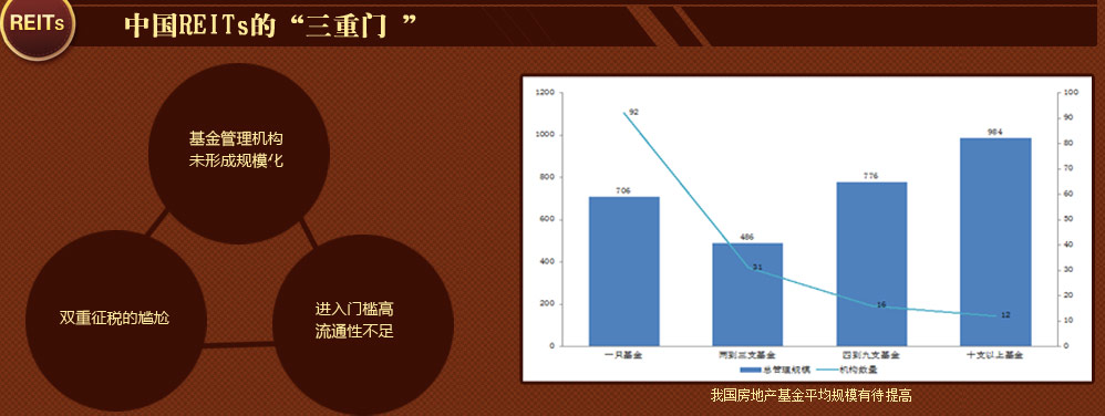 | REITs (Real Estate Investment Trusts,REITs) 即房地产投资信托基金。REITs起源于20世纪60年代的美国,近几年中国REITs的规模和数量快速增加。截至到2013年末,人民币房地产基金管理机构达到206家,发行437支房地产私募基金,管理的规模超过4000亿人民币。 目前,46%的房地产基金管理机构及48%的资金量投向了商业性质的城市综合体开发和商业地产领域。此外,有48%的房地产基金管理机构及43%的资金量投向了住宅地产。其余的部分主要关注工业地产、旅游地产、养老地产等新兴地产开发领域。 |