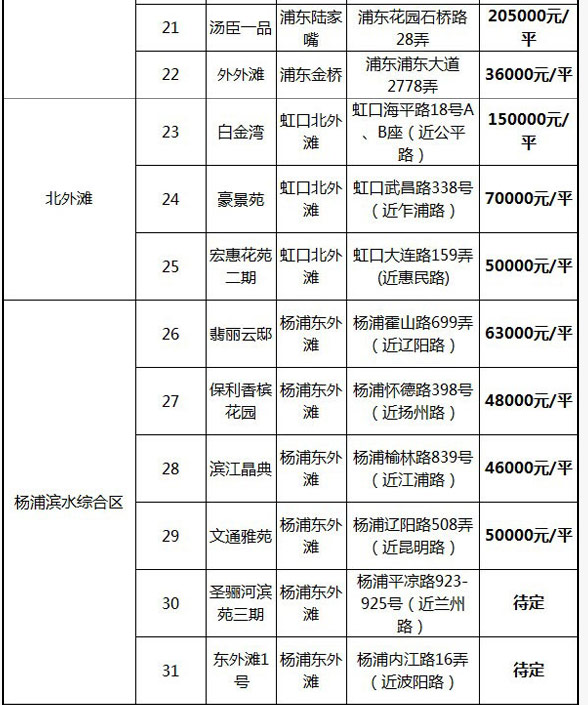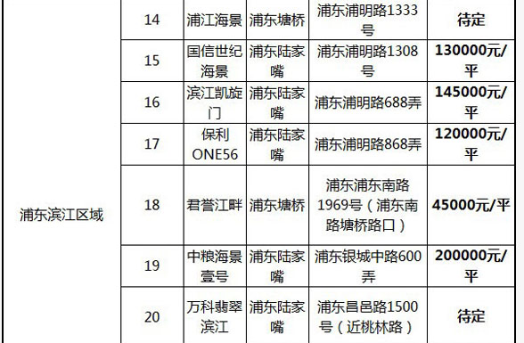 | 万科翡翠滨江位于昌邑路1500号,是陆家嘴东扩版图的首个地标性建筑。项目总建筑面积约40万方,由高端住宅、 商业、 办公、会所、幼儿园和小学多种项目业态组成。一期占地面积5.8万方,建筑面积27.2万方,全部精装修交付。二、三期尚在规划中。 | 外外滩位于金桥浦东大道2778弄,目前在售64平方米1房,109平方米3房,均价35000元/平方米。预计2015年年底毛坯交付。外外滩是黄浦江沿岸目前在售楼盘中价格最为亲民的楼盘。 |
