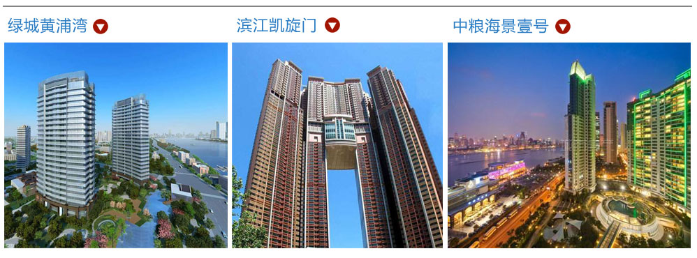 | 绿城黄浦湾总建筑面积约26万平方米,由7幢精装修高层公寓组成。一期主力户型面积为300—610平米。绿城黄浦湾采用国际现代滨水建筑风格,园区内精心保留的不同时代的老建筑,力求在创建崭新设计的同时,也使此地昔日的人文底蕴得以重现。 | 新鸿基开发的滨江凯旋门位于浦东陆家嘴滨江,项目规划建设包括高层住宅和裙房会所、低层住宅、公寓式办公楼、商业及地库停车场。10幢高层公寓均为大户型设计,改盘曾荣膺2012年全国时代豪宅第二名。 | 中粮海景壹号位于上海陆家嘴CBD核心,由5幢超高层江景公寓围合组成,总建筑面积约12万平方米,5幢超高江景公寓合围组成,2012年6月21日开盘,2012年10月底成交了一套单价21.6万元/平的房源,刷新了汤臣一品18.9万元/平方米的成交单价纪录。 |