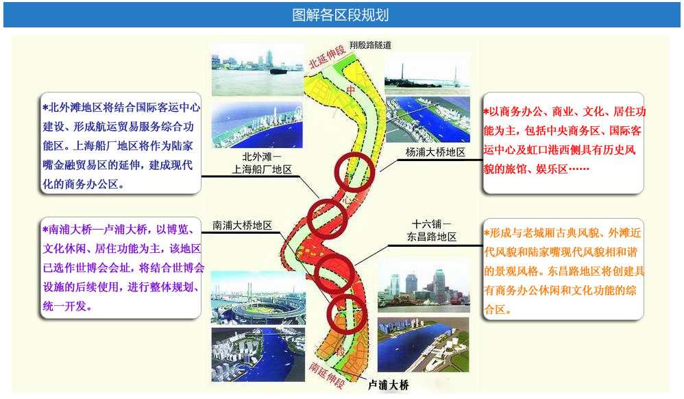 | 宝山滨江区:加快推进邮轮港商贸服务区建设 杨浦滨水综合区:以展示百年近代工业为主导,集博览、创意、旅游为一体 北外滩:建成国际航运中心、航运服务集聚区 浦东滨江区域:着力提升金融、贸易、航运服务等核心功能 黄浦滨江区:全面开展外滩金融集聚带建设,以世博场地开发为契机,完善商业和文化休闲服务配套功能 徐汇滨江段:重点发展高端商务、文化旅游等产业。 |