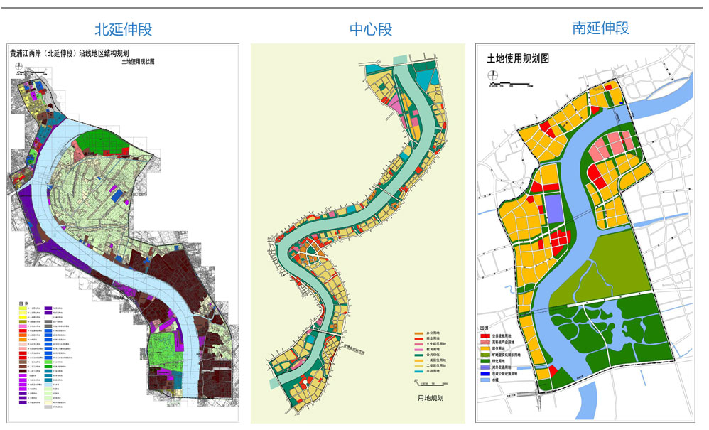 | 北延伸段将进行工业企业布局的调整,加强生态环境建设,适度发展现代服务业,形成生态环境优良的具有滨江特色的区段。已完成产业结构布局调整方案,划示为6个详细规划编制单元,其中浦西、浦东各3个单元。 | 中心段将改善地区自然生态环境,开辟活跃的公共活动岸线,创造具有强烈都市特征的滨水景观带和休闲旅游带。划示为20个详细规划编制单元,依照黄浦江东西两岸划分为浦东E单元系列和浦西W单元系列。目前已基本完成规划单元的编制任务。 | 南延伸段将以生态环境建设和文化旅游功能为重点,发展成为集文化旅游、居住休闲和高科技研发为一体,生态环境优良的功能区。结构规划于2003年由市政府批准,划示为7个详细规划编制单元,其中浦西4个单元,浦东3个单元。 |