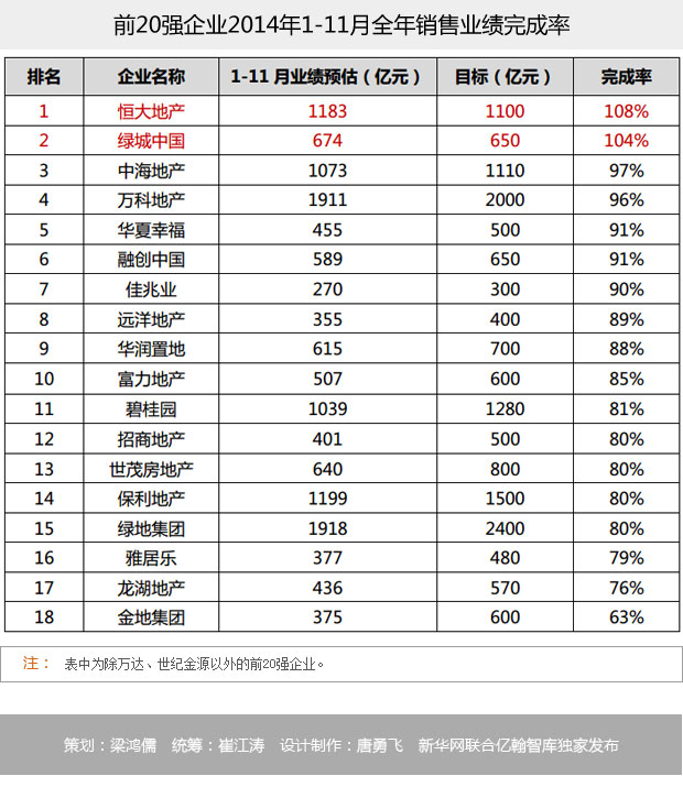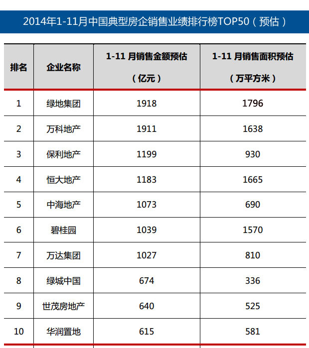 房企业绩榜 新华房产“房企业绩榜”是新华网联合房地产咨询服务机构亿翰智库,结合中国大陆以房产开发为主营业务的企业经营数据(住宅),独家发布销售业绩排行榜(TOP 50)。本栏目每月首周更新,时间跨度为从当年初到发布月(不含)止,所选取物业属性主要针对可售型住宅物业,数据来源亿翰智库数据及各企业公报等。