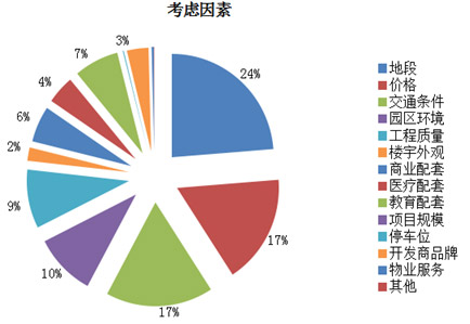 在调研问卷所列的影响消费者购房的14个因素中,被访者首要关注的因素是地段,比例为23.74%。其余依次是价格、交通条件、园区环境、工程质量、教育配套、商业配套、医疗配套、开发商品牌、楼宇外观、物业服务、停车位、项目规模。【详细】 |