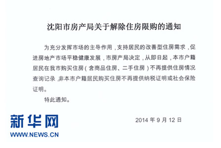 今日上午(9月12日),沈阳市房产局发布《关于解除住房限购的通知》,通知表示:"从即日起,本市户籍居民在我市购买住房(含商品住房,二手住房)不再提供住房情况查询记录,非本市户籍居民购买住房不再提供纳税证明或社会保险证明"。