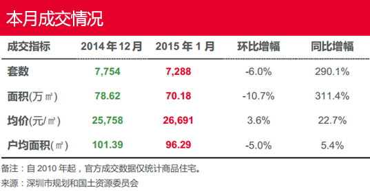 1月住宅成交仍旧处于高位,继2014年最后一个月突破7000套后保持7000套以上记录(自2009年07月以来),成交面积约70万平方米,环比跌6.0%,成交面积跌10.7%,成交均价微涨3.6%;同比成交套数涨2.9倍,成交面积涨3.1倍,成交均价涨22.7%。