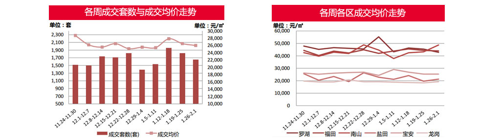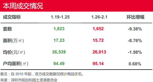 本周(1.26-2.1)一手楼成交价量齐跌,成交套数及成交面积环比跌幅均接近一成;全市成交均价微跌1.98%。
