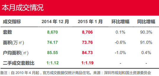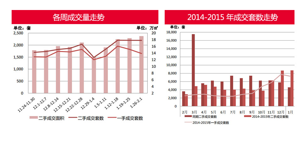 政策层面宽松,市场活跃,1月二手楼成交8706套,是2014年全年月平均成交套数的2倍左右。二手楼成交套数环比基本持平,同比暴涨超九成。