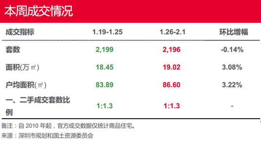 本周(1.26-2.1)二手楼市成交套数连续三周突破2000套大关,处于高位,本周楼市表现继续活跃,本周二手楼成交套数微跌0.14%、成交面积微涨3.08%。