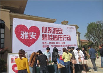 2013年4月20日,四川雅安发生里氏7.0级地震。随后,碧桂园全亚太区130个项目纷纷组织爱心捐赠活动,碧桂园生态城除组织内部员工积极捐款外,于4月27日至5月3日,在销售中心前广场及外展点举行雅安地震绿植义卖活动,所得善款悉数捐向灾区。同时在项目微博与微信上开展爱心大转发活动,“领走一盆绿植 献出一份爱”,“爱心大转发”,号召江城市民为灾区人民提供力所能及的帮助。