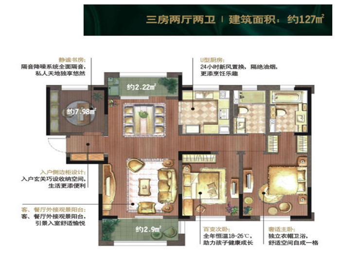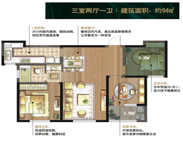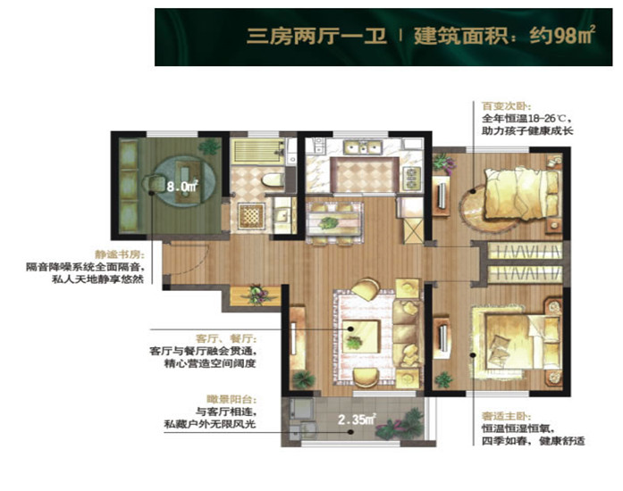PM2.5爆表?在朗诗•太湖绿郡不用担心这样的问题。朗诗•太湖绿郡装配有最先进的置换新风系统,在把室外新鲜空气置换入室内的同时,会对空气进行两级过滤,第一级过滤处理直径大于5微米的灰尘及其他悬浮物,第二级过滤处理直径大于1微米的灰尘及其他悬浮物,也就是说朗诗住宅对于空气的过滤标准早已超越了PM2.5,领先国际。 作为颠覆传统的科技住宅,朗诗•太湖绿郡采用了欧洲成熟十大顶尖科技系统,全年实现室内恒温、恒湿、恒氧的绿色生活,营造领先传统住宅、同步世界人居典范的健康舒适享受。