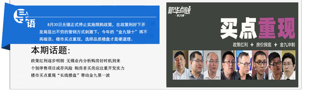 一年一度的“金九银十”又将拉开战幕,作为传统旺季,“金九银十”向来是“兵家必争之地”。为了提高营业额、增加市场占有率,开发商必然使出浑身解数,动作频频。再加上8月末无锡限购令已经解除,众多业内人士均表示在政策利好的条件下无锡楼市极有可能再度得到提振。