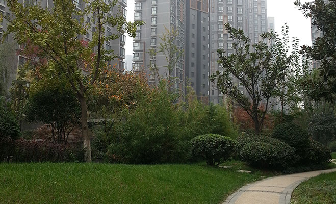 记者本次的调查主要在一期进行,一期的绿化做的非常好,草坪、花坛、绿树环绕着几栋住宅楼,绿树成荫、花草成片,各种造型的绿植处处可见,整个小区显得郁郁葱葱、生机勃勃。记者在小区转了一圈后发现,整个小区并不是很大,楼宇之间穿插着几个小广场,分别配有幼儿及成人活动器材,有几个妈妈带着小宝宝在玩跷跷板。中午时分,旁边不远处的社区内部幼儿园静悄悄的,应该是孩子们在午休。