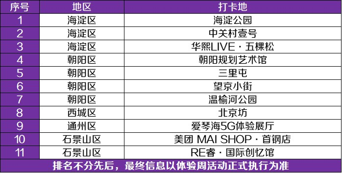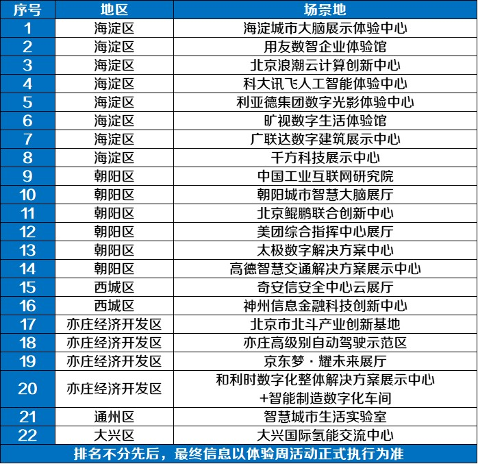 据主办方透露,数字经济体验周开放超40个数字经济代表性企业展馆、智慧商圈、数字化城市公园以及信息消费体验中心。其中包括22处数字经济场景地、11处数字经济网红打卡地及12处信息消费体验中心,涵盖海淀、朝阳、西城、通州、大兴、石景山、亦庄等主要城区。市民可微信搜索“北京数字经济体验周”官方小程序,了解更多体验周活动详情。