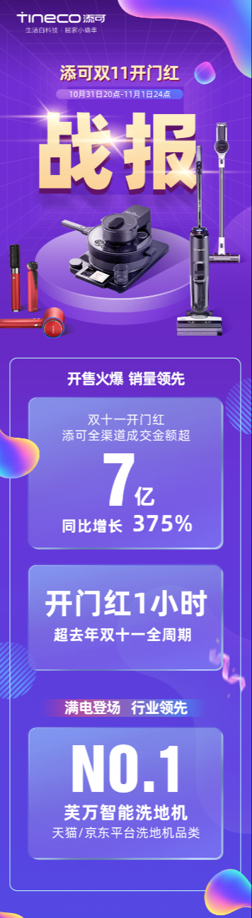 11月1日,各大电商平台传来捷报,添可喜迎开门红,全渠道成交额超7亿,同比增长375%,开门红1小时超去年双11全周期,芙万智能洗地机天猫、京东平台洗地机品类NO.1。添可又交出了一份令人满意的答卷,为双11大促全面爆发打下了坚实基础。继618跃升天猫小家电品牌成交榜NO.1,添可再度爆红的背后,是市场对于添可创新科技产品力和硬核国货品牌力的高度认可。