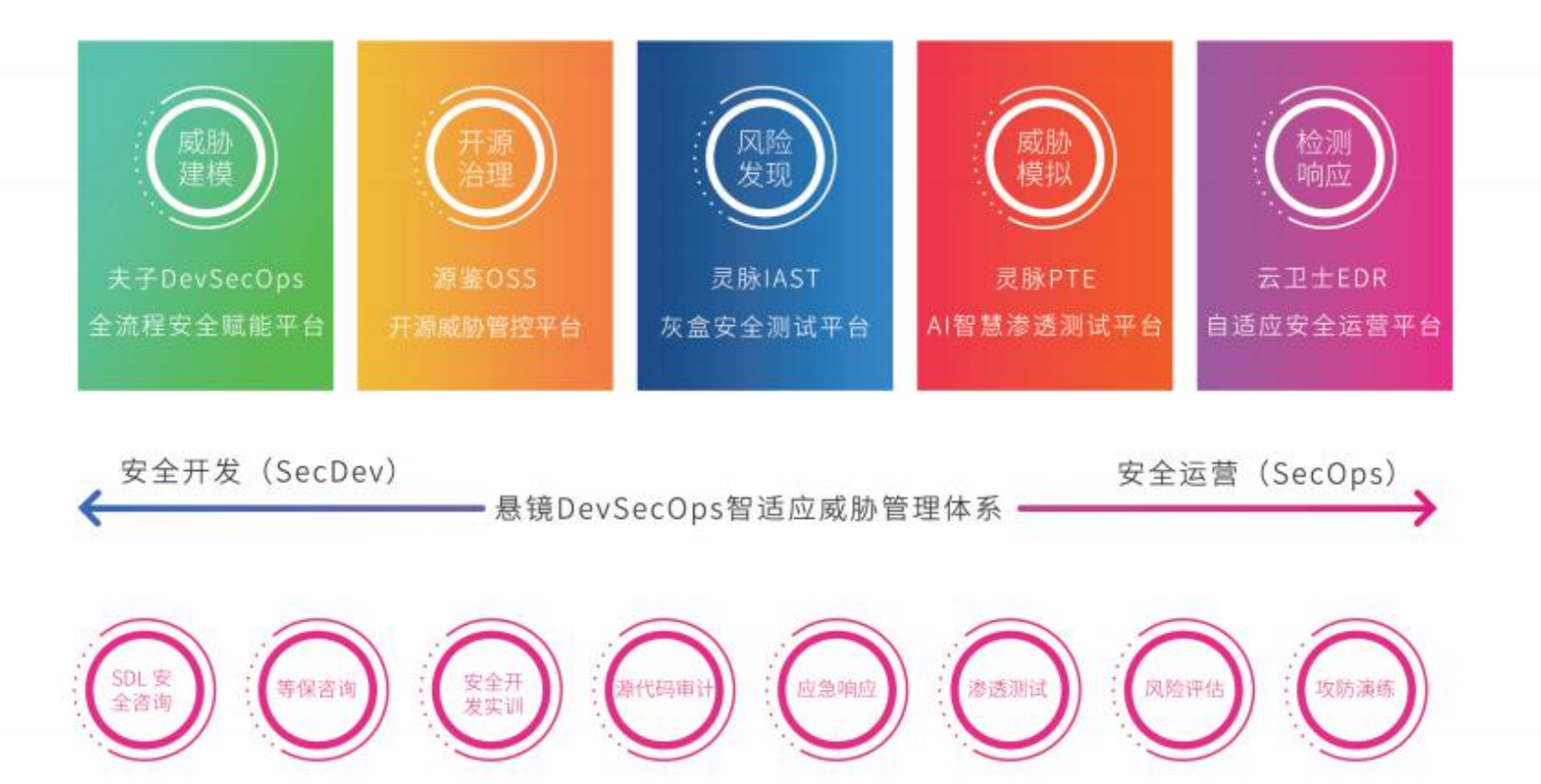该方案还融合了悬镜安全的红蓝对抗经验,全流程的产品和服务为金融行业客户提供包括威胁建模、开源治理、风险发现、威胁模拟、检测响应在内的全生命周期安全解决方案,协助金融客户建立DevSecOpsCI/CD黄金管道,利用关键CI/CD自动化工具链技术(IAST应用安全测试、SCA第三方组件成分分析、RASP运行时应用自保护、红蓝对抗和SRC),实现CI/CD自动化工具链对业务系统的支撑。