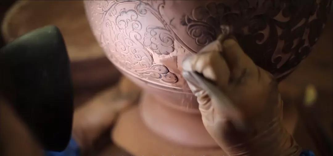 3、雕刻:坭兴陶主要靠雕刻工艺装饰。坭兴陶的泥料特定,宜于浮雕、平雕、捏镂、填充和镶嵌等手法进行工艺装饰。