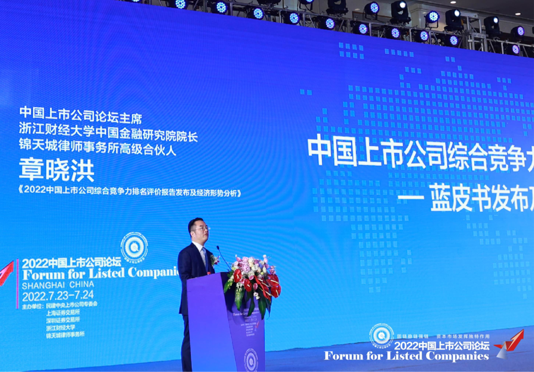 中国上市公司论坛主席、浙江财经大学中国金融研究院院长、锦天城律师事务所高级合伙人章晓洪在论坛上发布了《2022中国上市公司综合竞争力排名评价报告》并对经济形势进行了分析。报告立足于国内外宏观经济大势,通过对中国上市公司各个维度指标梳理、比对、演算并运用科学的研究方法形成综合竞争力评价体系,较为全面、科学地衡量企业是否在其创新发展、成长质量、盈利能力等多方面达到国内领先水平。