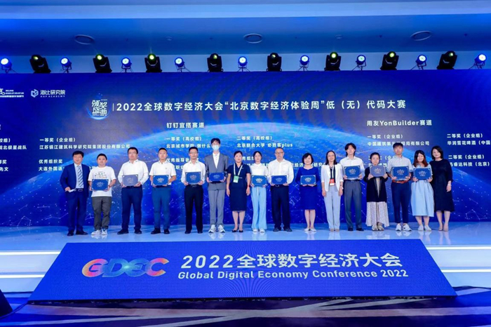 7月30日,2022全球数字经济大会成果发布会在北京国家会议中心举行。作为大会重要成果之一,“2022北京数字经济体验周”——低(无)代码大赛获奖名单在大会上正式发布。来自各赛道的高校学生和企业获奖代表,以及优秀指导教师、优秀高校组织奖等获奖代表,站上大赛的颁奖舞台,接受颁奖。