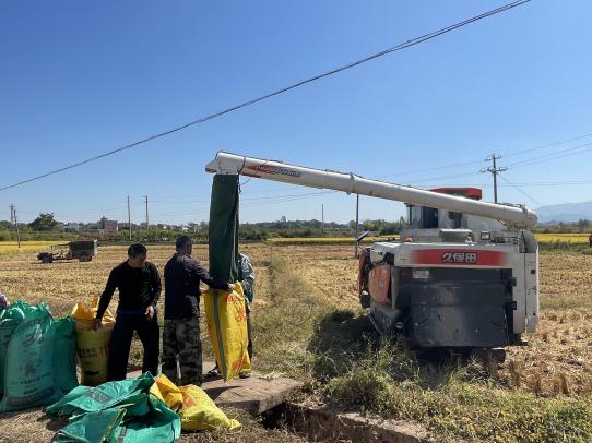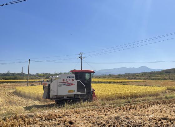 10月10日,在广东省乡村振兴驻沈所镇工作队推动的始兴米业提升水稻种植示范田(都塘片区)机器轰鸣。