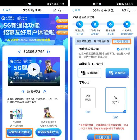 设置方法:江苏移动掌上营业厅搜索“5G新通话”-报名参加友好用户体验-设置新通话功能-无障碍设置-语音转写选择大字-开通设置。