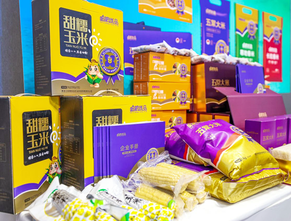 哈尔滨市粮食局在2023乡村振兴与产业帮扶大会暨新华网溯源中国“种子计划”第二季活动现场展出系列农特产品。新华网 李想 摄