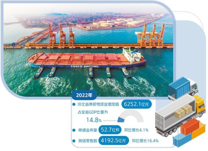 首衡高碑店农副产品物流园商贸交易高速增长,是河北全面建设全国现代商贸物流重要基地的一个缩影。“河北全国现代商贸物流重要基地建设全面提速,2022年全省商贸物流业增加值6252.1亿元,占全省GDP比重为14.8%;快递业务量52.7亿件,居全国第五位,同比增长4.1%,增速高于全国平均水平2个百分点;网络零售额4192.5亿元,同比增长16.4%,增速高于全国平均水平12.4个百分点。”河北省商务厅厅长张泽峰说。