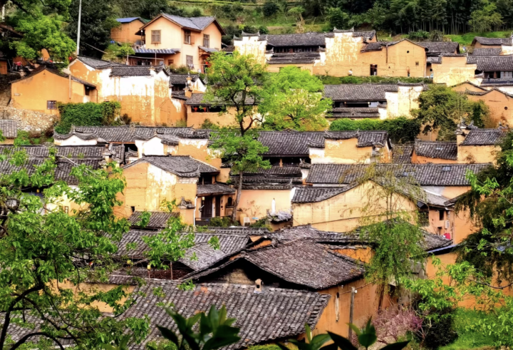 汽车在崇山峻岭中蜿蜓上行,翻过一道道岭,夕阳的余晖洒满了山梁。忽然,绿色波谷间几十幢泥黄色土木结构的古民居,像电影的推拉镜头扑面而来,它们庄严肃穆、层层叠叠、错落有致、依山而踞。