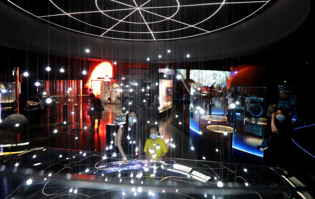 参观者在上海天文馆“家园”展区内一个名为“太阳的邻居”的装置展品前驻足观看。新华社记者 方喆 摄