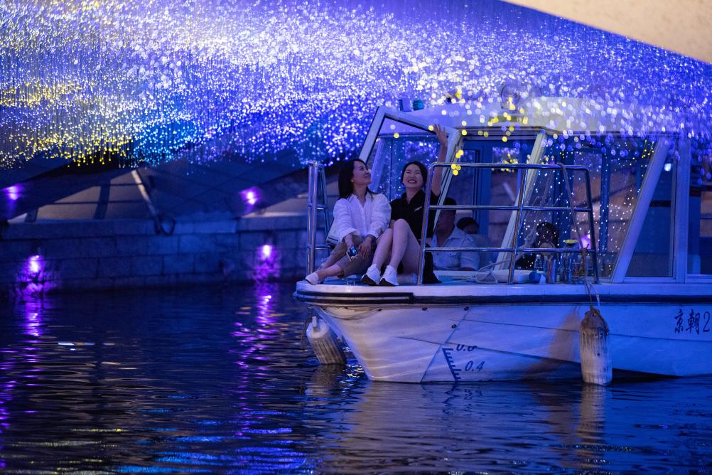 这是人们乘坐北京亮马河游船经过被装点成“星空”的好运桥。 新华社记者 陈钟昊 摄