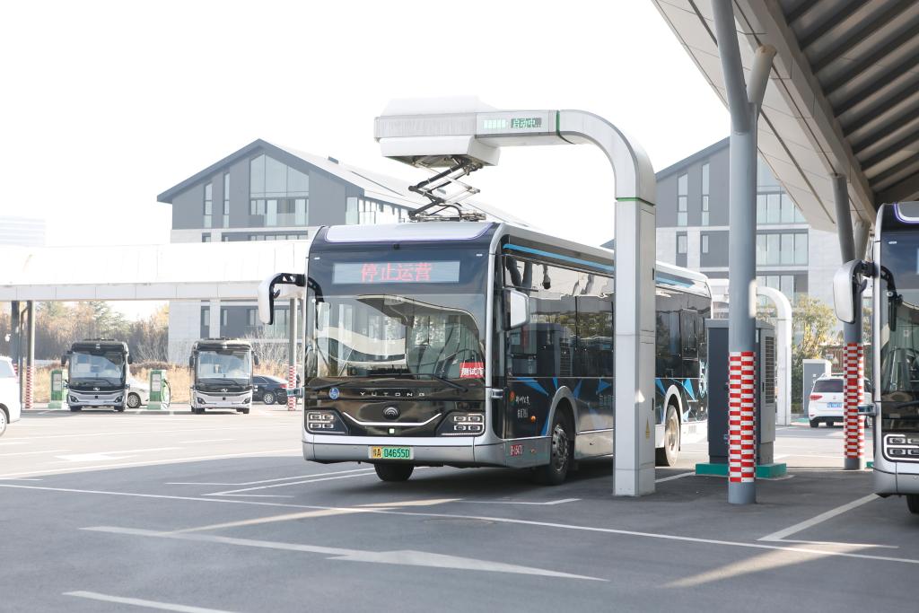图为一辆智能公交车在河南郑州郑东新区自动驾驶一号线场站内充电。新华社记者戴翘楚 摄