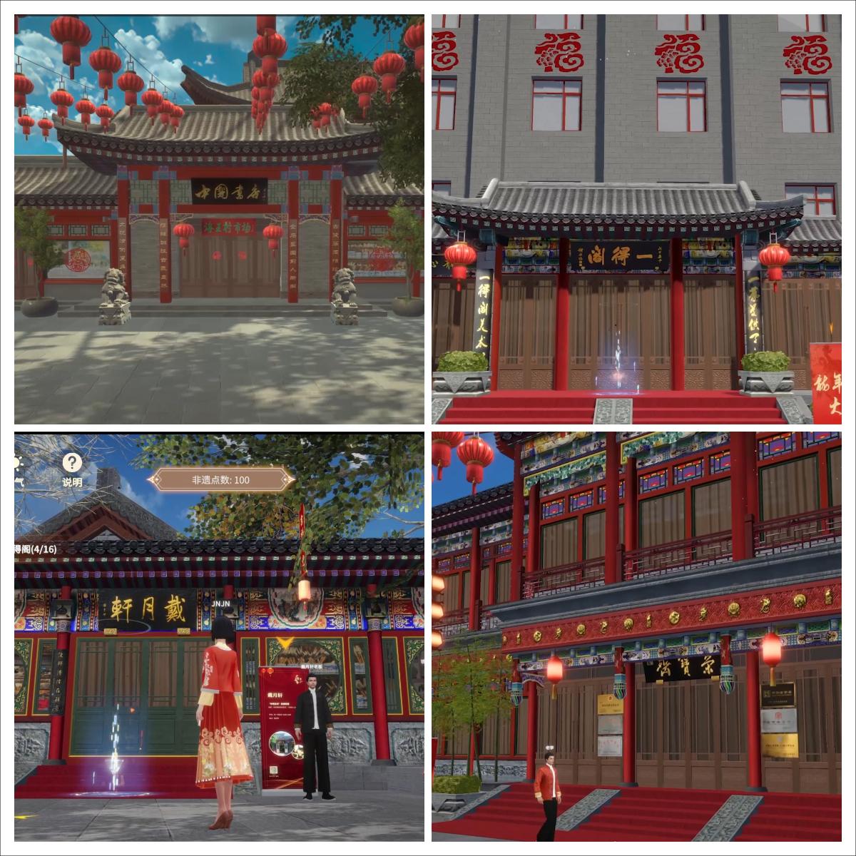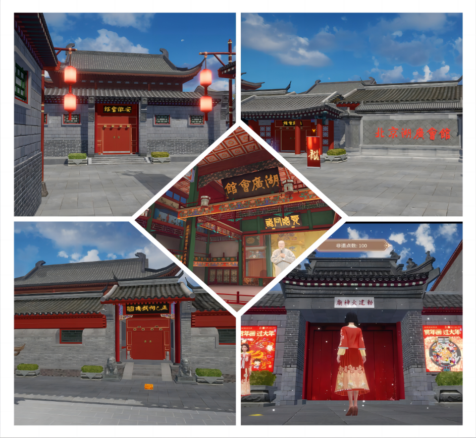 用户可通过扫描二维码登录厂甸庙会元宇宙空间,以数字人身份游览整个街区,通过寻找“文房四宝”为主线故事,了解非遗老字号历史,置身湖广会馆沉浸式观看戏曲演出,体验猜灯谜、写福字、非遗制墨、烟花燃放等互动活动,也可店内购物,通过参与线上活动获得非遗积分有机会在线下庙会联动兑换小礼品。