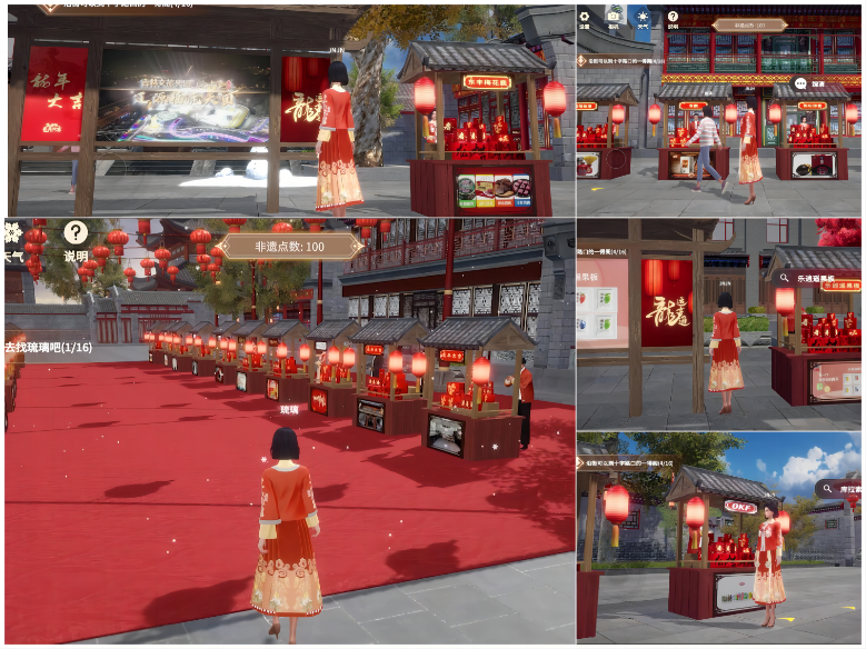 2024龙年新春,元宇宙厂甸庙会重磅升级上线。北京市西城区文物保护管理中心联合中国移动咪咕公司运用大场景沉浸式数字孪生、数字人、高精度精准空间计算、XR云渲染等业内领先技术,打造文旅融合数字经济标志性示范场景,推动琉璃厂历史文化街区数实融合和非遗区域性整体保护和活化利用。整体复刻呈现了琉璃厂东西街区和南新华街1600米街区,重点刻画湖广会馆、安徽会馆、荣宝斋、一得阁、等街区地标性重点建筑和非遗老字号内外部场景,综合展现民俗节市活动、公共文化服务等内容。构建翰墨飘香、文商并举的百年琉璃厂历史文化街区风貌,再现京味浓厚,商娱相融的厂甸庙会盛景。春节期间,注册用户达到5.6万,累计访问11万人次。