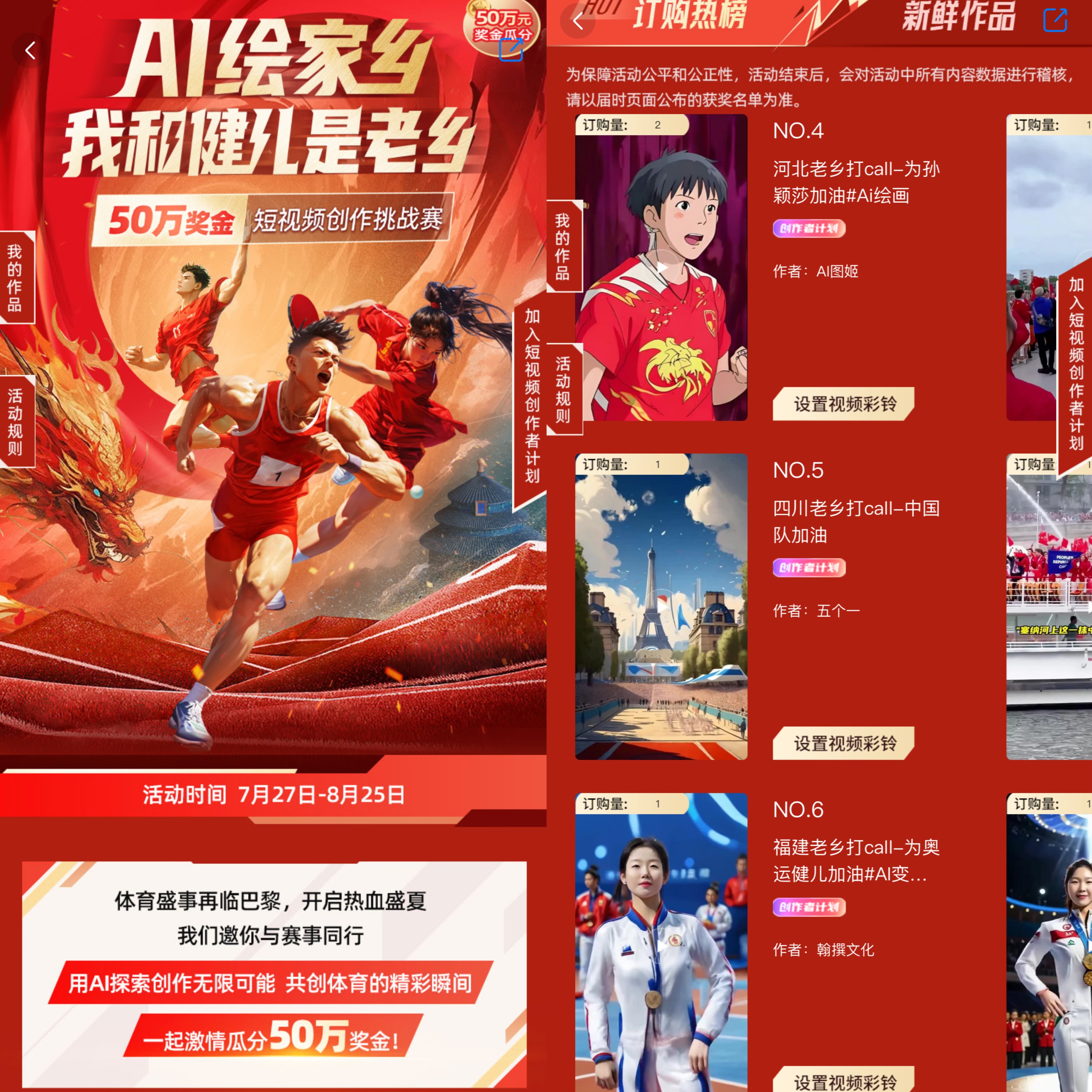 “河北老乡打CALL-为孙颖莎加油!”“四川老乡打CALL-为吴艳妮加油!”近期,“AI绘家乡”活动已在咪咕音乐、咪咕音乐极速版、小程序“咪咕视彩号”上线,来自全国各地的用户、短视频创作者纷纷上传自己的AI作品,多支精彩的短视频更成为奥运期间的爆款视频彩铃。当每一通来电响起,都和来自家乡的健儿热爱同频,一起创造属于今夏的荣耀时刻。