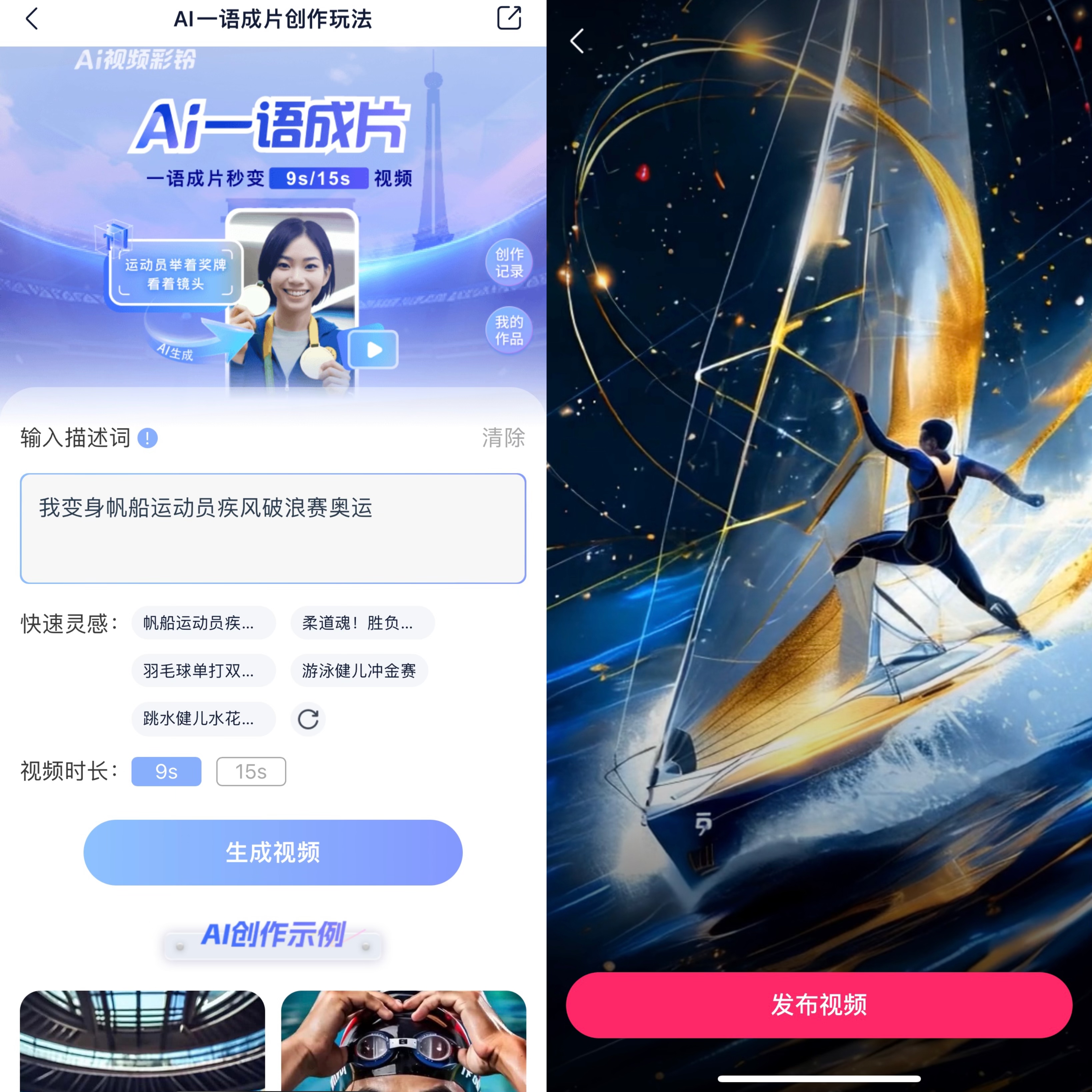 这届巴黎奥运,00后的“小孩姐”和“小孩哥”们纷纷上场,冲浪、滑板等项目不断刷新纪录,追赛事热点成为奥运迷们每天的“必修课”。想拥有一支乘风破浪的高光时刻短片?用AI一语成片,让你的冲浪灵感具象化,一键就能创作你的AI冲浪奥运大片!AI一语成片是一款文生视频彩铃应用,让想象触手可及,只需输入一段灵感文字,比如“帆船运动员疾风破浪赛奥运” “羽毛球单双打激烈竞技”,AI就能帮你生成一段原创的AIGC巴黎奥运短视频,设置为视频彩铃,巴黎奥运的各种高光时刻就这么AI了!
