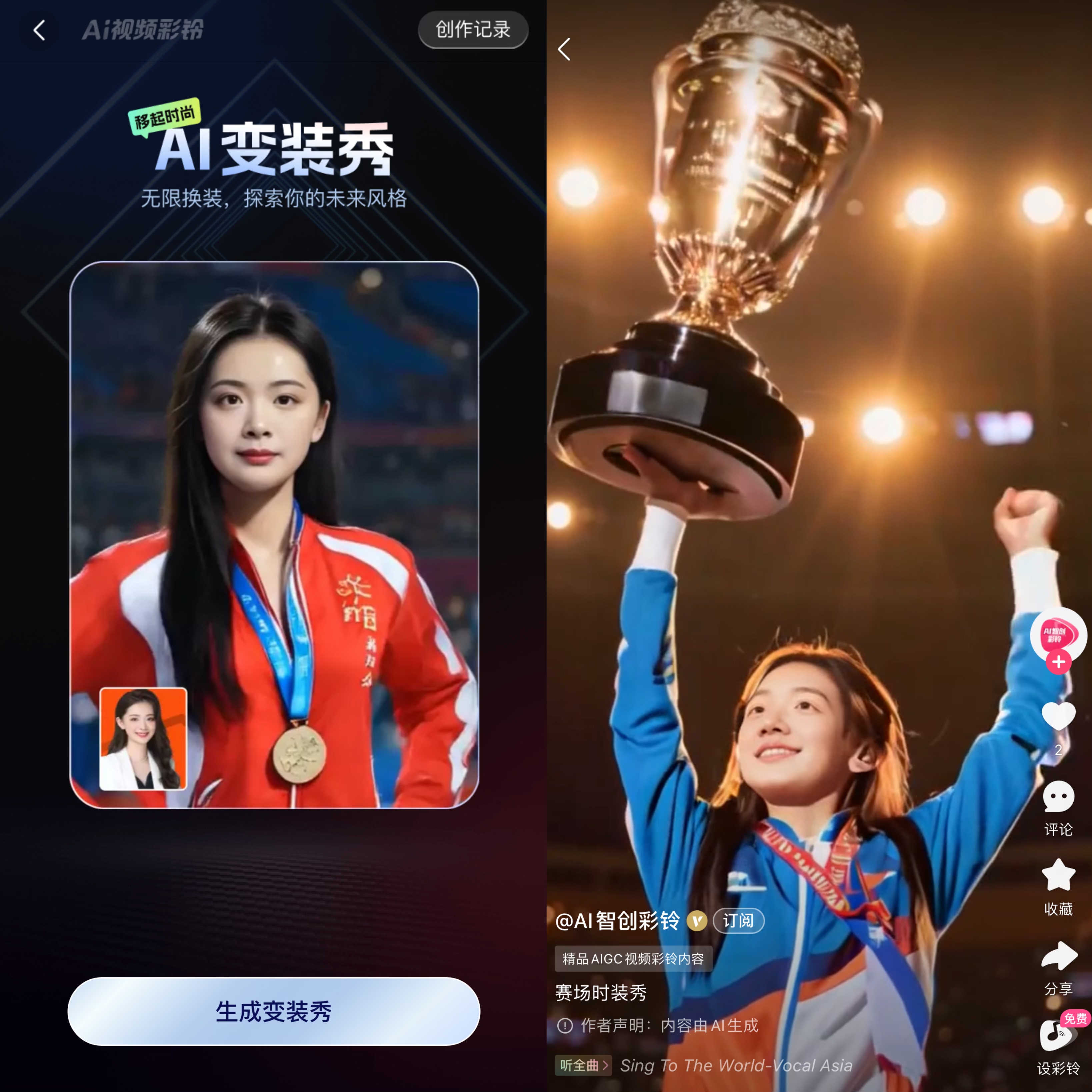 AI变装秀基于行业领先的元裳服装大模型算法生成,为用户提供多种时装风格的智能切换,展现个人时尚品味与个性魅力。用户只须上传一张照片,选择服饰风格,就可以拥有一支风格十足的奥运赛服变装短视频,一键设置为视频彩铃,让每通来电都与巴黎赛场上的心跳同频共振。
