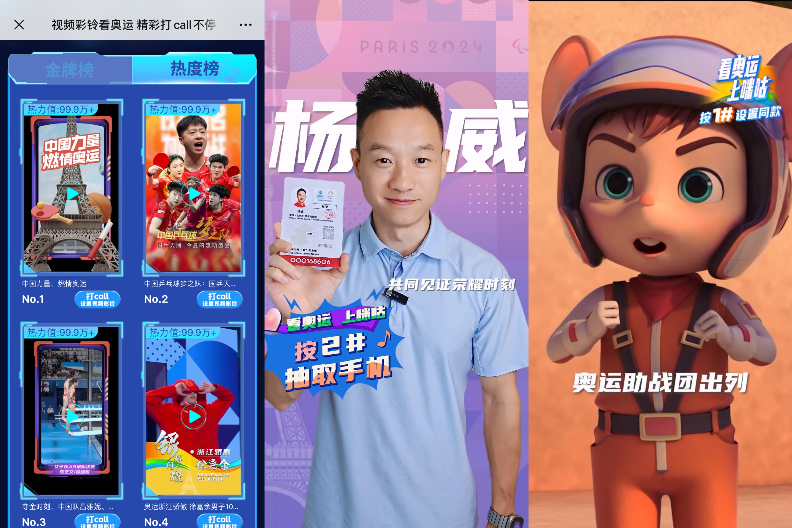 “梦之队系列”视频彩铃则将中国跳水队、中国乒乓球队、中国举重队健儿的奥运风采一举囊括,其中,国乒天团征战奥运的名场面集锦更成为“热度榜”上的人气视频彩铃。此外,以AI技术呈现奥运赛场、带领观众“走进”巴黎的“AIGC系列”视频彩铃也收获了极高热力值,排名“热度榜”前列。