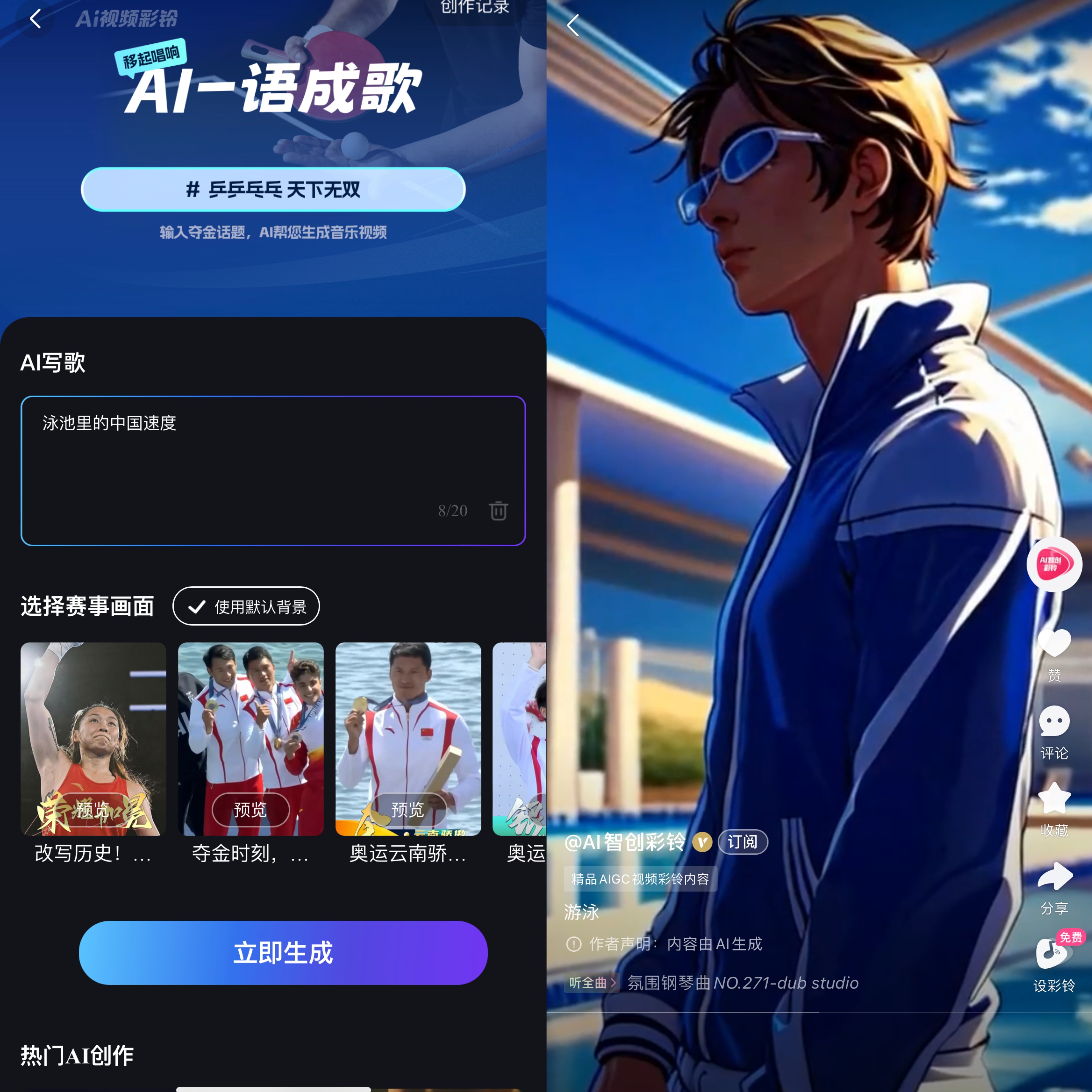 想为中国健儿放声呐喊,不妨为健儿写首歌。上微信小程序“咪咕视彩号”、咪咕音乐、咪咕音乐极速版,使用AI一语成歌创作工具,输入想要的主题和风格就能轻松get一首原创加油歌。作为国内首款文生音乐视频彩铃应用,AI一语成歌可智能完成词、曲、编、唱、录、混全链路音乐创作,让每个人都能成为音乐创作人。