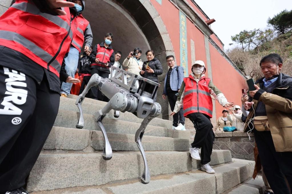 山东省泰安市泰山景区工作人员在测试机器狗 隋翔 摄