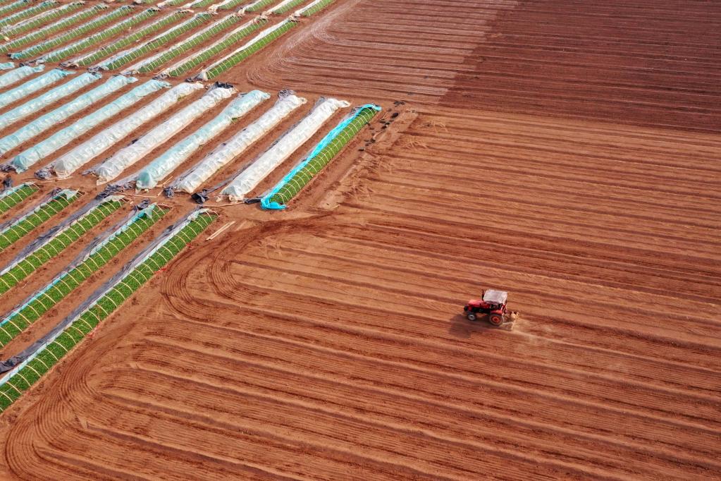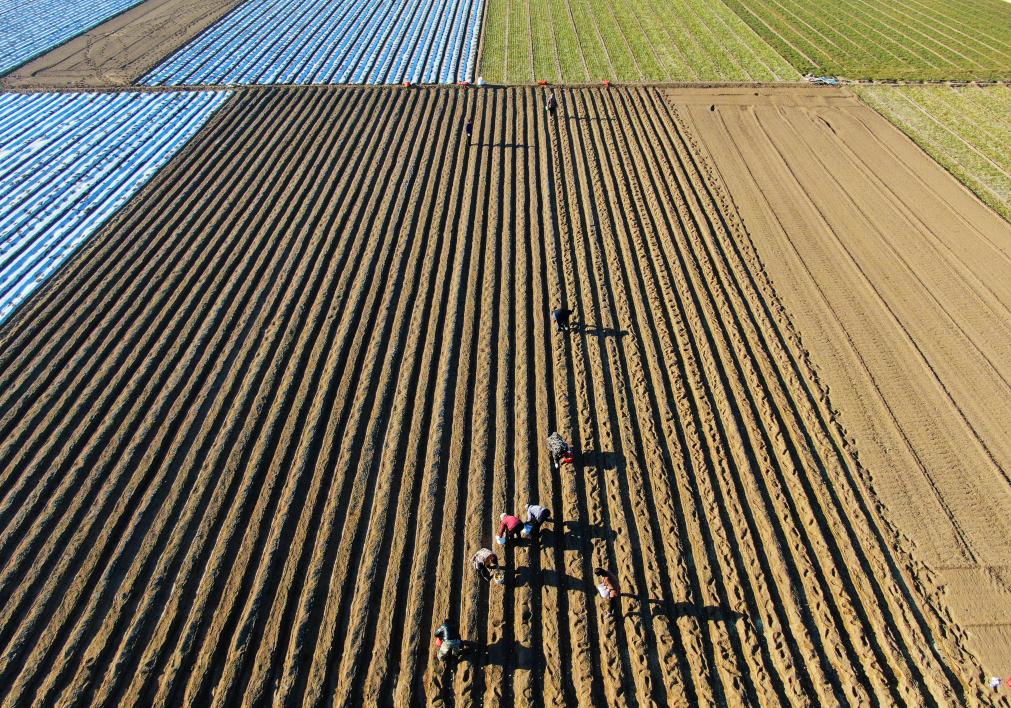 2月24日,农民在山东省临沂市平邑县仲村镇一处马铃薯种植基地忙碌(无人机照片)。 新华社发(武纪全 摄)在广袤的田野上
